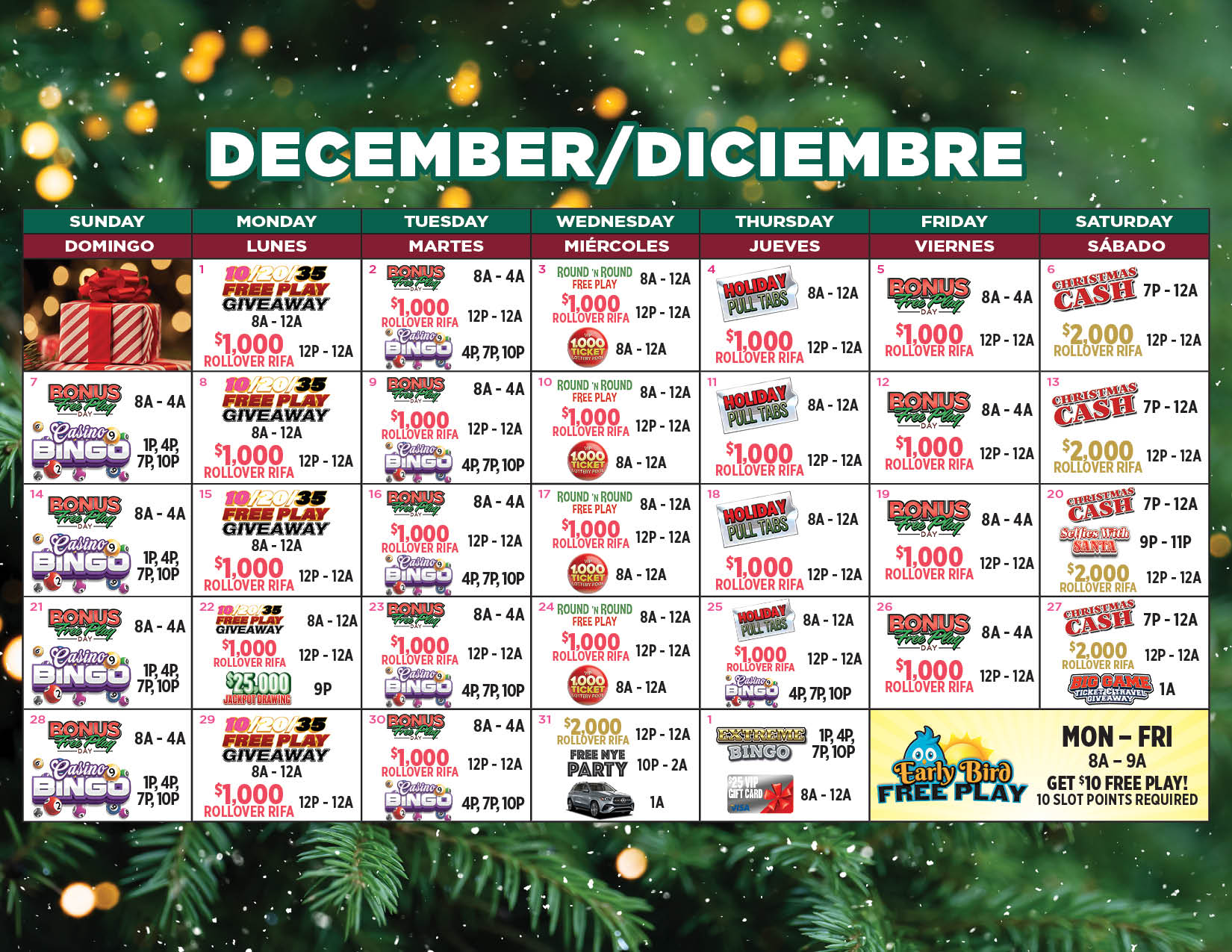 Get free entries daily (Rollover rifa below). VIPs earn Golden entries with every 1000 slot points from Dec 1 - 21. On the night of the drawing, 5 finalist are called, 3 from the golden drum and 2 from the rollover rifa drum.