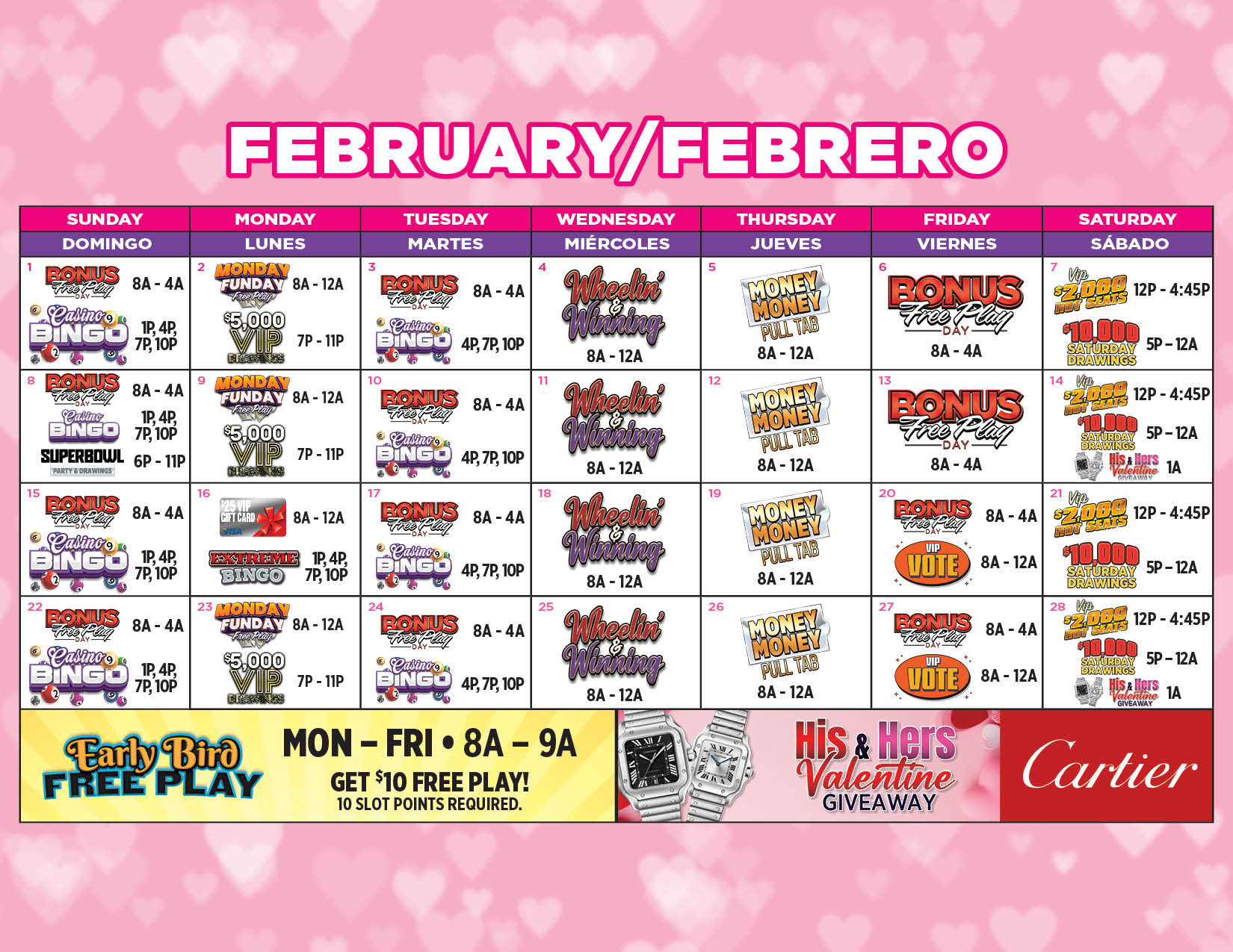 7pm, 8pm, 9pm, 10pm = $1,000 free play and 11pm = $1,000 cash.