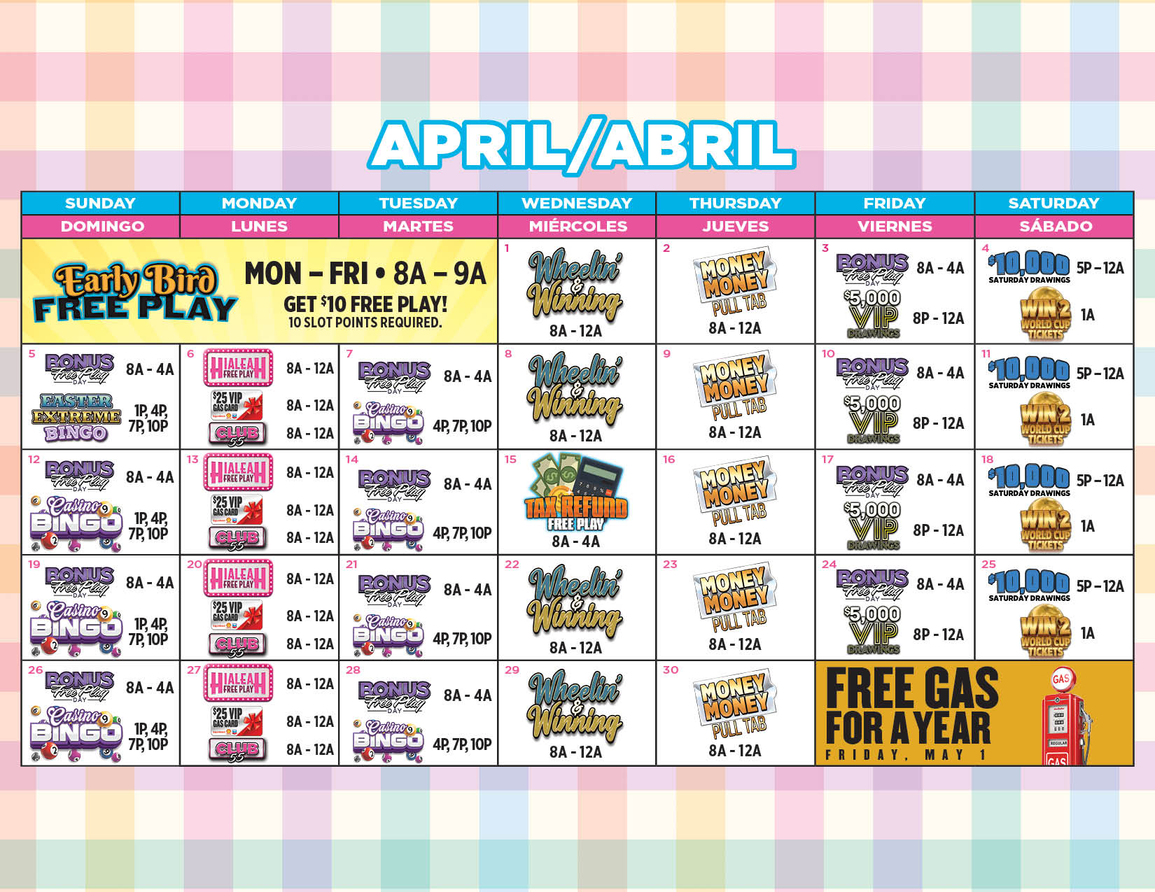 2x bingo at 1pm (pays double). Normal Bingo at 4pm, 7pm & 10pm.