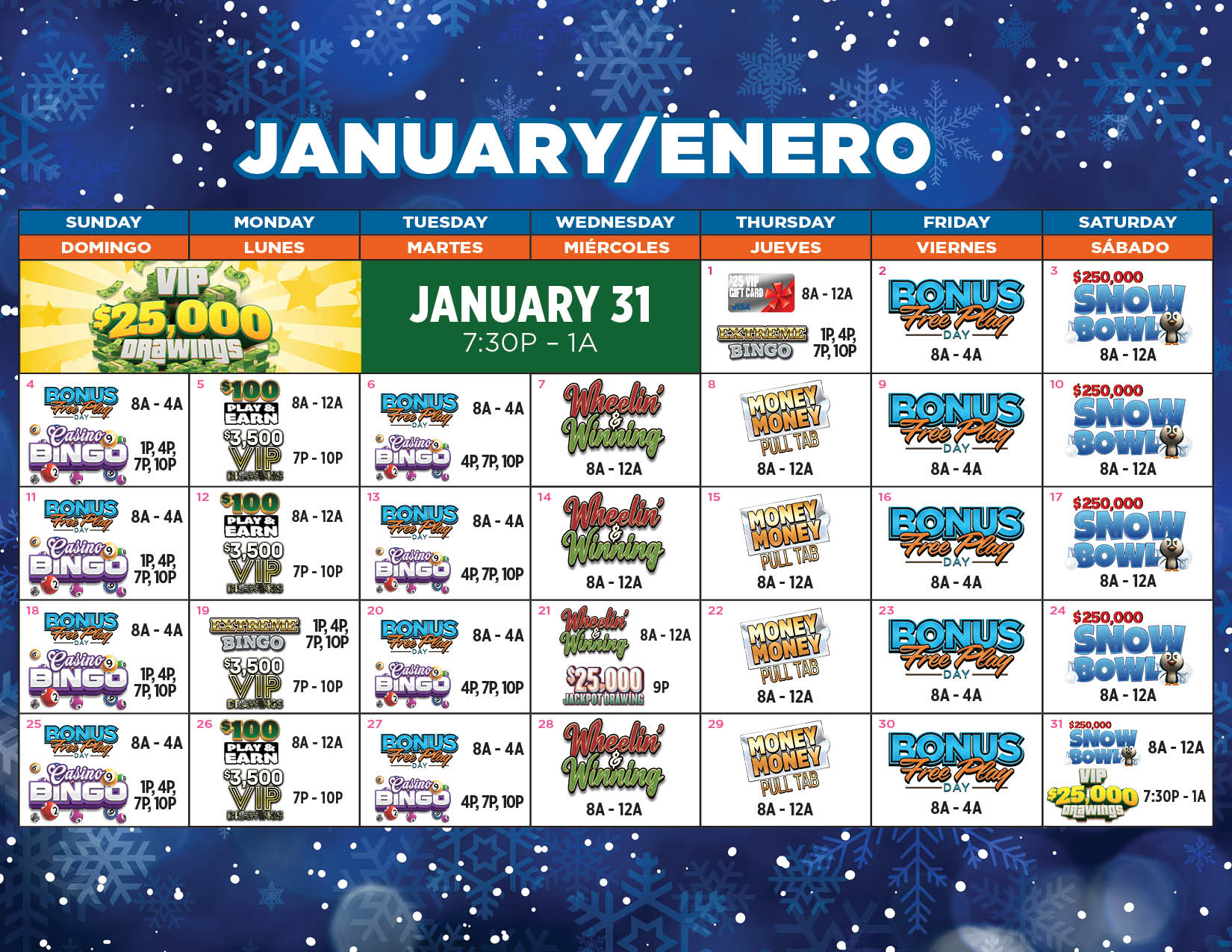 Earn 25 slot points and play the Snow Bowl game on the kiosk and win! Grand prize is $250,000 cash.